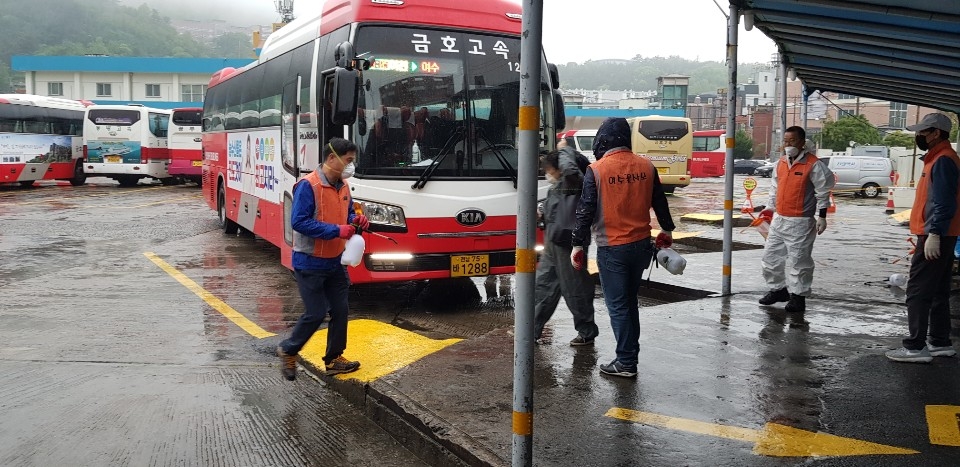 시외버스에서 내리는 대형화물 중에는 외국에서 건너오는 물건도 있는데 이 화물을 내리는 장소는 방역을 더욱 철저히 해야 한다. 내리는 비에도 아랑곳없이 소독을 이어가는 이들을 보고 한 어르신은 “고생이 많으시다”며 고마움이 담긴 말을 건넸다.