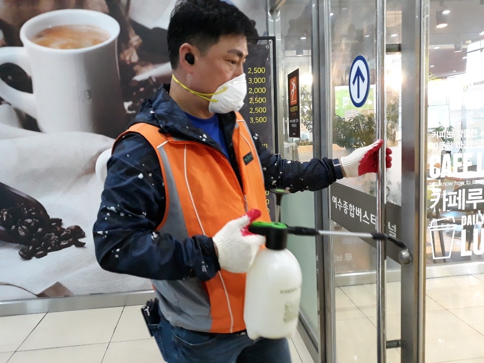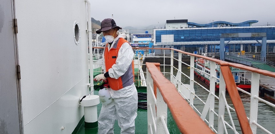 여객선터미널로 장소를 옮겨 바닥과 건물 내부 기둥을 집중 소독했다. 공공장소는 쓰레기통 주변과 청소도구함, 사람의 손이 미치는 계단 등에 중점을 두고 소독약을 뿌려야 한다.