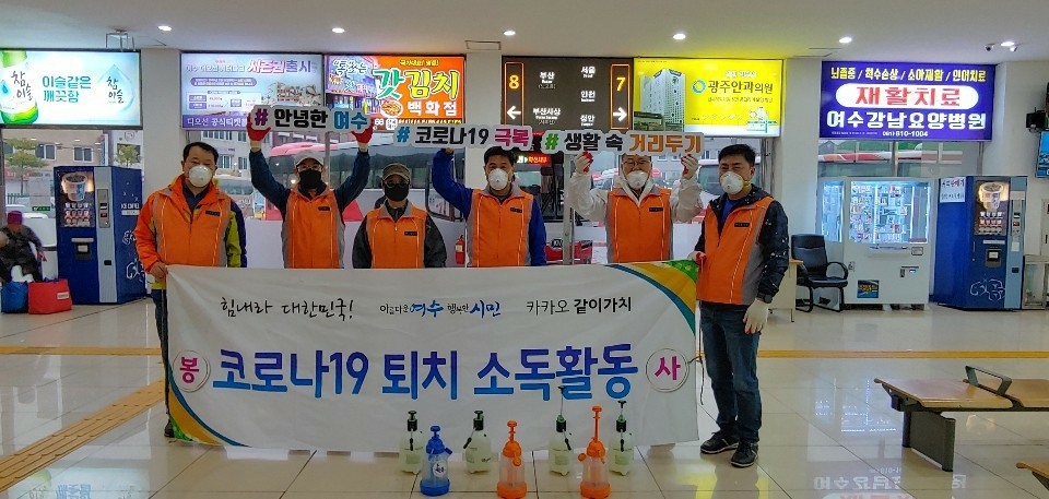 여수꽃사모 회원들이 연휴를 앞둔 지난 26일 여수시수산물특화시장과 여수항여객선터미널, 오동도, 자산공원, 해상케이블카승강장, 돌산공원 소독에 이어 3일 여천고속버스터미널, 여수고속버스터미널, 돌산대교 밑 유람선승강장, 돌산 신기항 등 4곳을 소독했다.