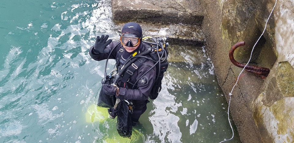 그런만큼 이날 열린 여수해양구조단의 해양청결활동은 더욱 의미가 있다. 흐리고 바람 부는 날씨에도 장비를 갖춘 6명의 잠수부들은 유탑마리나호텔 리조트 앞 바닷가에서 차례로 바닷속에 들어갔다.