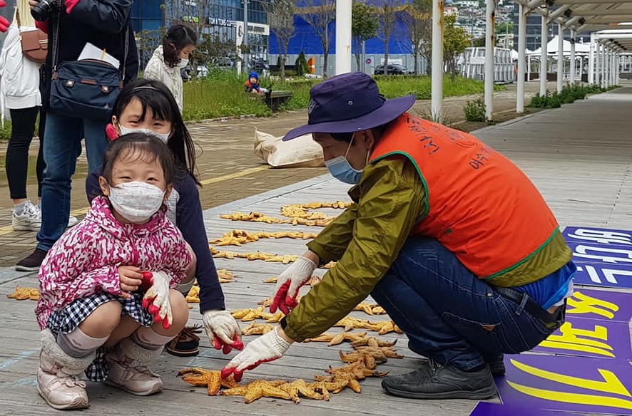 아이들은 적극적으로 나서서 목장갑을 끼고 분필 글씨 위에 불가사리를 올려놓았다. 서울에서 왔다는 한 아이는 “해변에서 불가사리를 본 적 있지만 이렇게 많은 불가사리는 처음 본다”고 말했다.