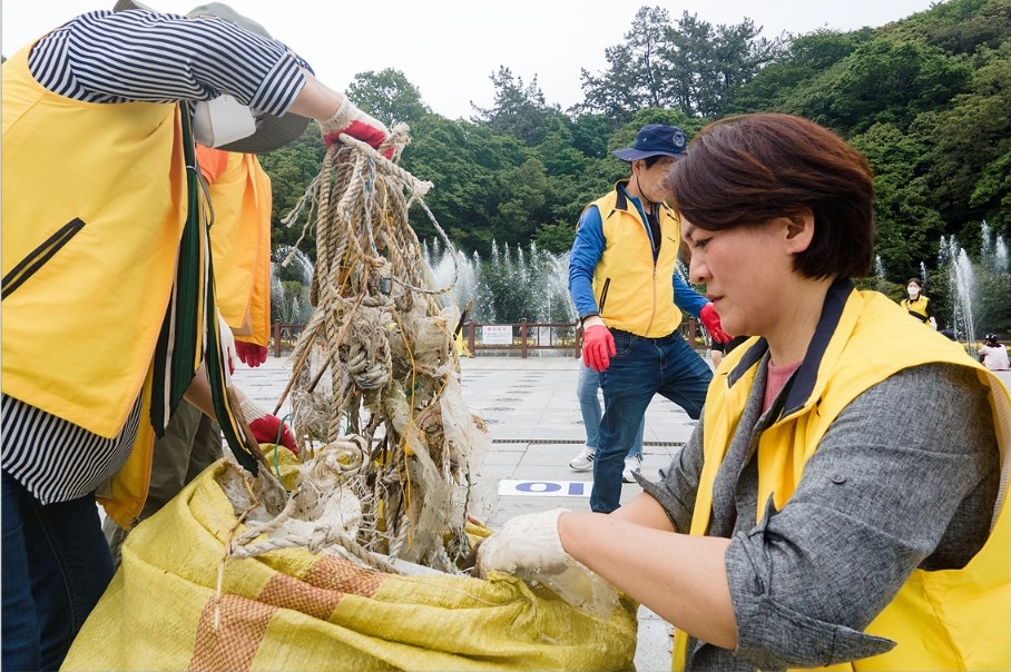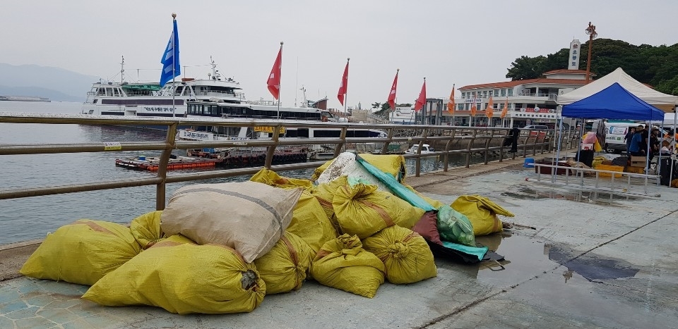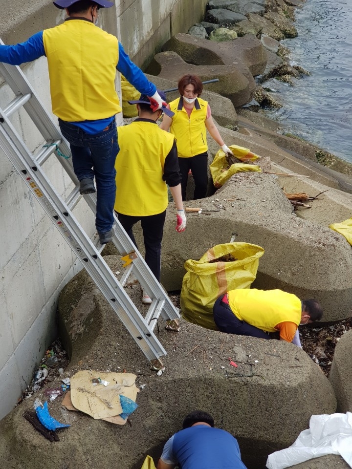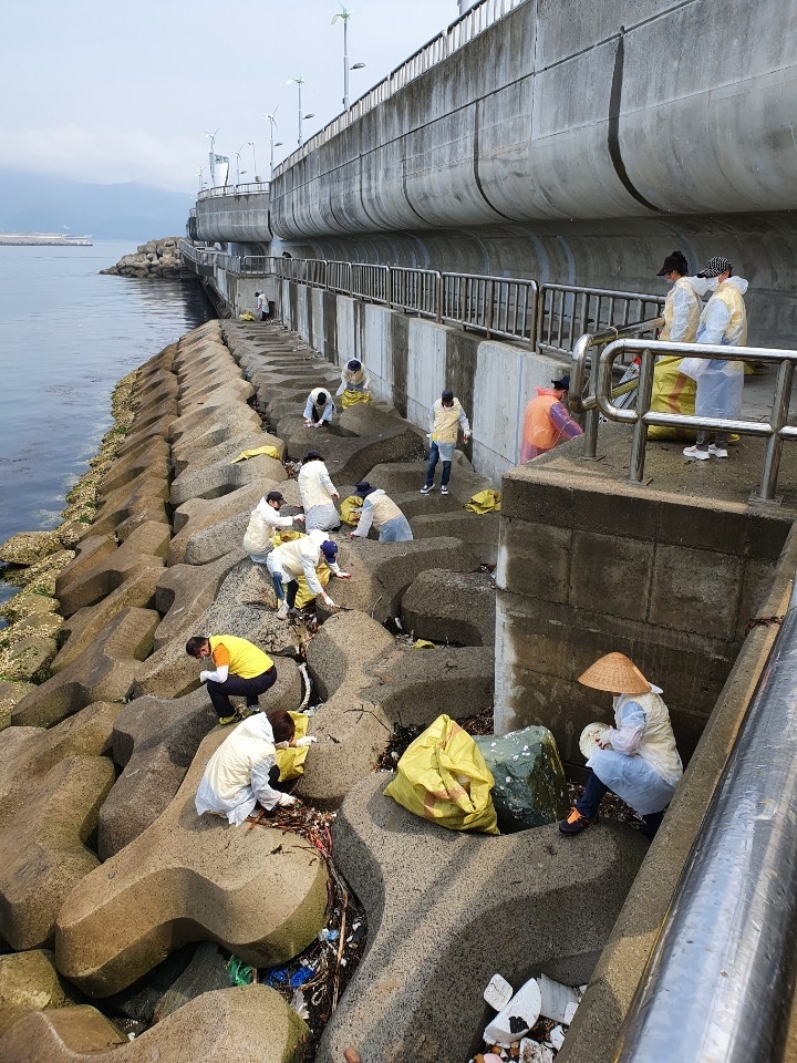 또한 봉사자들은 준비한 사다리를 이용해 테트라포드로 내려가 사이사이에 버려진 쓰레기들을 주웠다. 썩지 않는 플라스틱 페트병과 선원들이 버리고 간 밧줄, 어구용 스티로폼 등이 여기저기 널브러져 있었다.