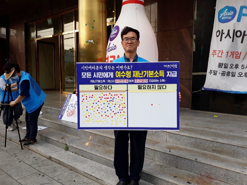 재난기본소득에 대한 시민들의 꾸준한 요구에도 여수시가 꿈쩍하지 않자, 여수시민협이 6일 ‘여수형 재난기본소득’ 지급 찬반여부를 묻는 길거리투표를 실시했다.