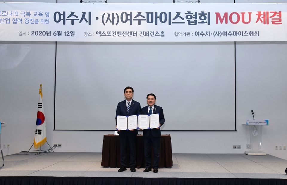 코로나19로 침체된 여수 MICE 산업 육성과 지역경제 활성화를 위해 여수시와 (사)여수마이스협회(협회장 송대수)가 업무협약을 체결했다.