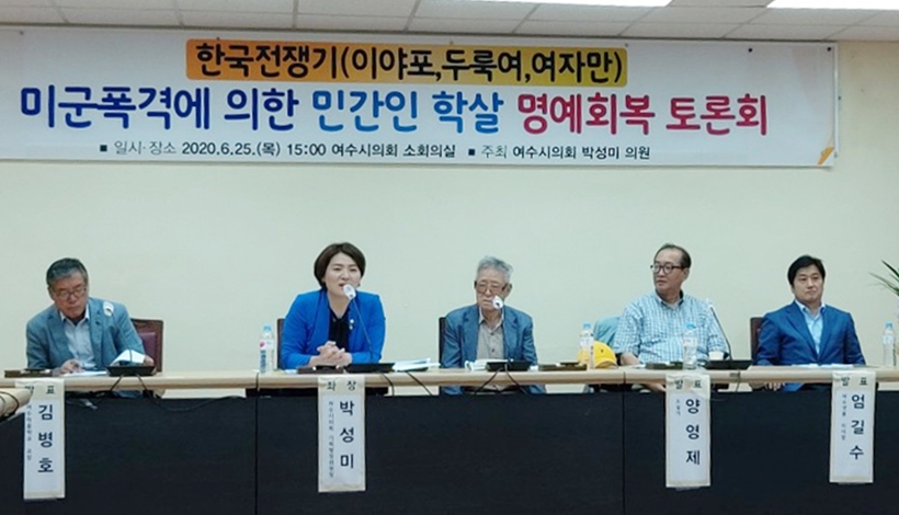 여순항쟁과 함께 우리 지역의 아픈 현대사인 '이야포 두룩여 미군 폭격 민간인 학살사건'이 70주년을 맞은 가운데 지난 25일 오후 여수시의회 소회의실에서 '한국전쟁기 이야포, 두룩여, 여자만 미군폭격 민간인학살 명예회복 토론회'가 열렸다.