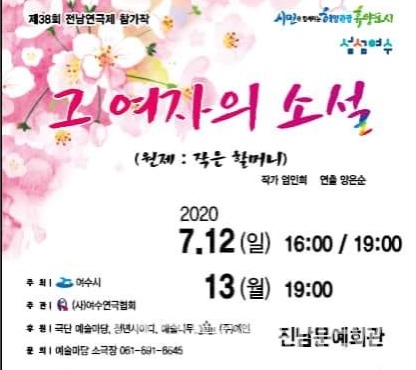 7월 12~13일 양일간 진남문예회관에서 개봉한 제38회 전남연극제 참가작인 <그 여자의 소설>은 여수시가 주최하고 사단법인 여수연극협회가 주관했다. 엄인희 작가와 양은순 연출의 작품이다.