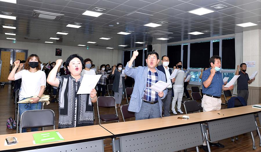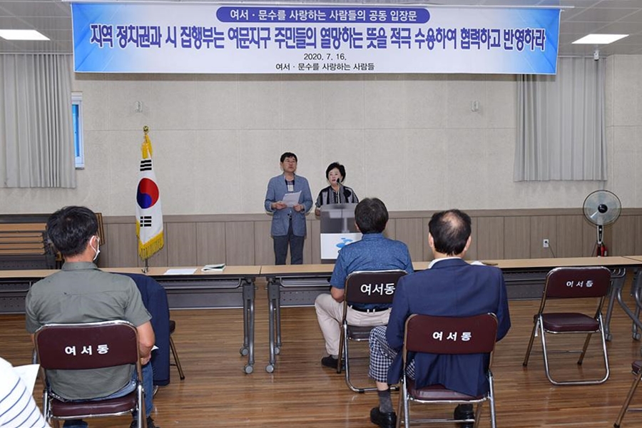 여서동, 문수동의 주민자치위원장과 주민대표 등으로 구성된 ‘여서‧문수를 사랑하는 사람들’이 16일 오후 여서동 주민센터 대회의실에서 여수시가 추진하는 여문지구 활성화 사업의 시행을 촉구하는 공동 입장문을 발표했다.