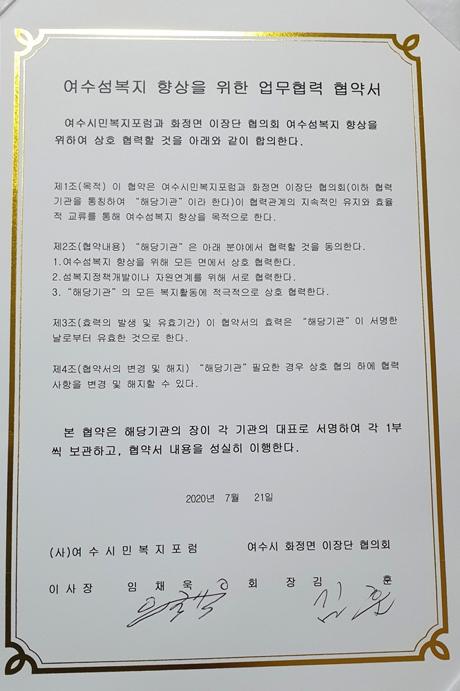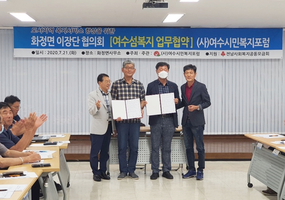 화정면 이장단 협의회(회장 김훈)와 (사)여수시민복지포럼(이사장 임채욱)이 21일 화정면 면사무소 2층 강당에서 협약을 체결했다.