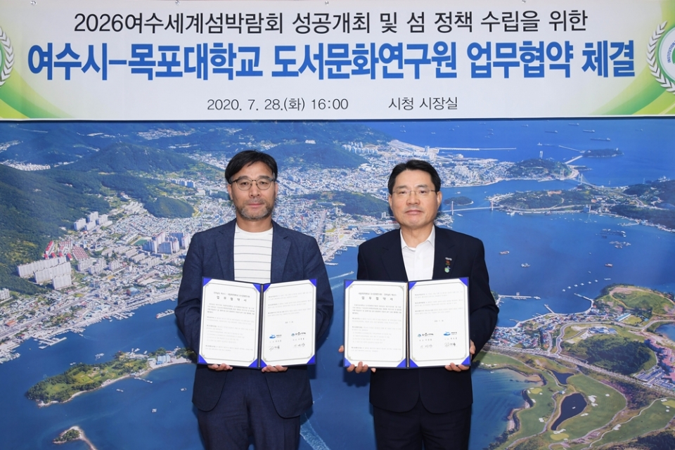 여수시(시장 권오봉)와 목포대 도서문화연구원(원장 이경엽)이 28일 여수시청 시장실에서 '2026여수세계섬박람회' 성공개최 및 섬 정책 수립을 위한 업무협약식을 가졌다.