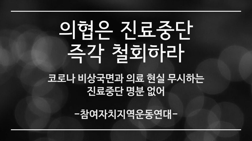 이에 참여∙자치∙분권∙연대의 정신에 기반하여 활동하는 전국 19개 시민사회단체들로 구성된 참여자치지역운동연대는 의협이 자신들의 이해관계를 지키기 위해 국민건강을 담보로 집단행동에 나선 것을 납득할 수 없으며, 즉각 집단적인 진료거부를 철회할 것을 요구한다. 아울러 정부가 더 많은 의료인의 확충과 공공의료기관설립에 나설 것을 촉구한다.