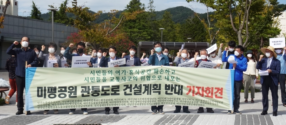 여수시민단체가 24일 11시 미평공원 중앙광장에서 ‘미평공원 관통도로 건설 반대 기자회견’을 열었다.