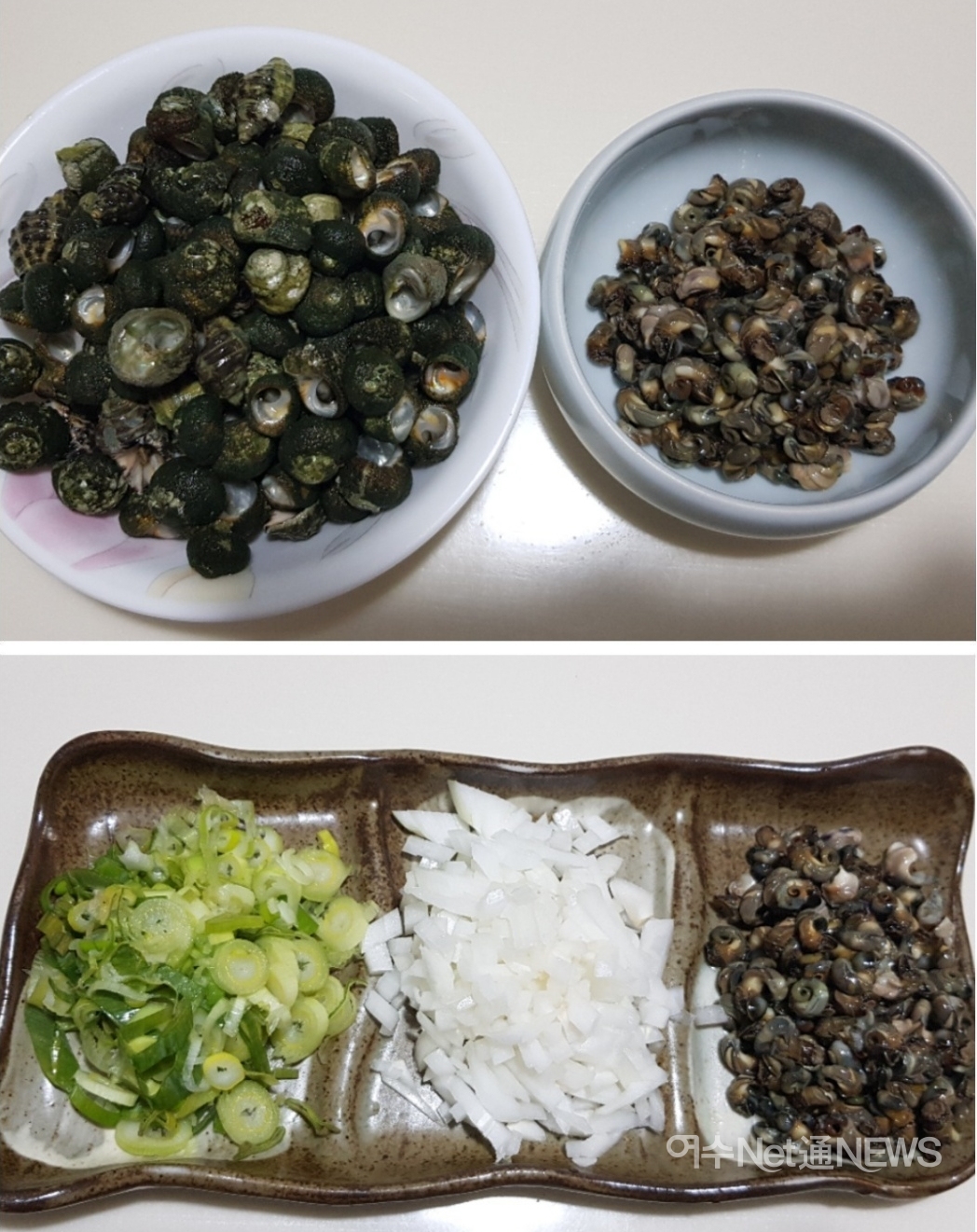 3. 까놓은 고동은 물을 조금넣고 바락바락 주물러 밑에 가라앉은 모래는 버린다. 고동 물과 남아있는 고동 살에 물을 넣고 소금과 양파 다진 것을 넣어 국보다 진하고 죽보다 연하게 물량을 맞추어 끓인다.