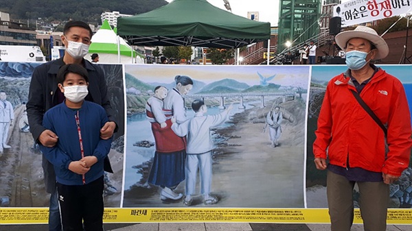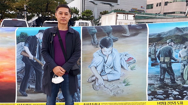 문화제가 열리는 이순신광장 주변에는 여순사건 희생자를 기리는 30여 개의 걸개 그림이 전시되고 있었다. 그림의 주인공은 여수에서 활동 중인 박금만 화가이다. 그의 작품 속에는 여순사건 당시 희생된 할아버지와 생존해 계신 그의 부친의 그림이 있다. 문화제가 열리는 현장에 참석한 박금만 화가의 부친인 박영수(83세)씨를 만나 당시의 상황을 들었다.