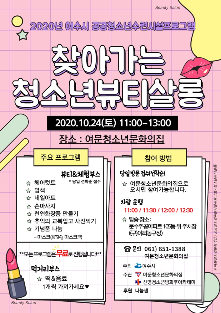 24일 열리는 뷰티살롱은 여문청소년문화의집에 소속된 여수정보과학고 뷰티과 학생 동아리가 어르신에게 화장과 네일아트를 해드리고 다른 학생들은 준비된 교복을 입은 모습을 사진에 담을 예정이다.