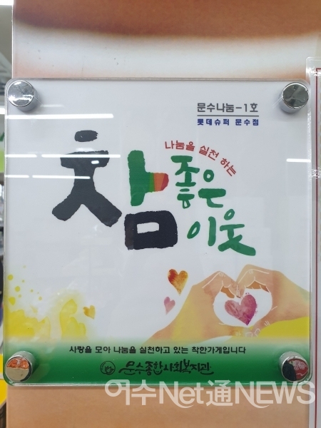롯데슈퍼는 지난 2018년 12월부터 지역사회와 함께하는 아름다운가게로, 문수복지관 선정 '참 좋은 이웃 1호점'이다. 현재까지 400만원 상당의 후원을 지속해 오고 있다.