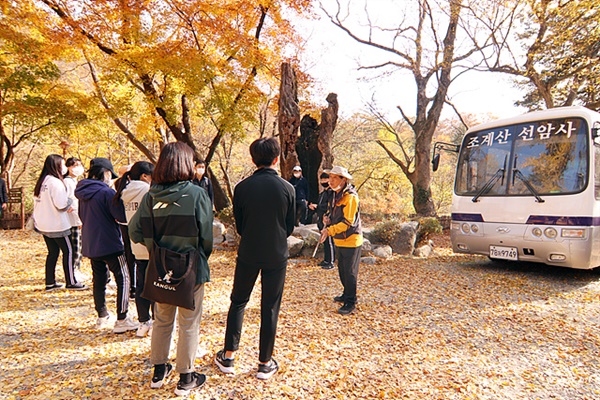 8일 오전 9시 30분, 선암사 주차장에 내린 학생들은 아름답게 물든 단풍을 바라보며 들떠있었다. 학생들은 김배선씨의 설명에도 아랑곳하지 않고 재잘대며 선암사로 올라가고 있었다. 10여 분쯤 올라가니 선암사 일주문이 보이고, 주변에는 노란 은행잎이 널려있어 더욱 운치가 있었다. 한 부부가 커다란 고목을 배경으로 사진을 촬영하고 있었다.