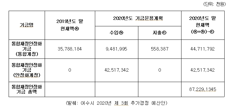 코로나19로 대부분의 예산이 삭감된 반면, 유독 통합재정안정화기금에 420억원이라는 막대한 돈이 내부거래로 비축된 것이다. 통합재정안정화기금은 올해 중순 행정안전부 권고로 올 10월 시행된 ‘여수시통합재정안정화기금조례’에 근거해 신설된 기금이다.