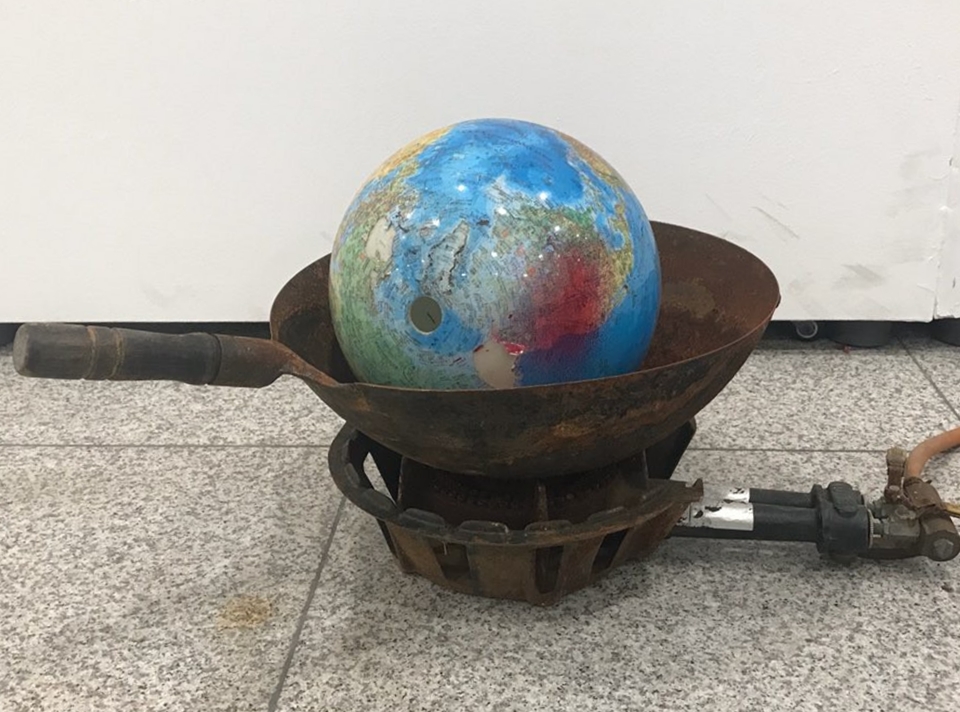 작품 '지구온난화' 는 제목에서 나타나듯이 지구온난화로 인해 때 아닌 폭염과 폭설이 일어나는 영화같은 현실이 부끄러워 이미지를 형상화한 작품이다.