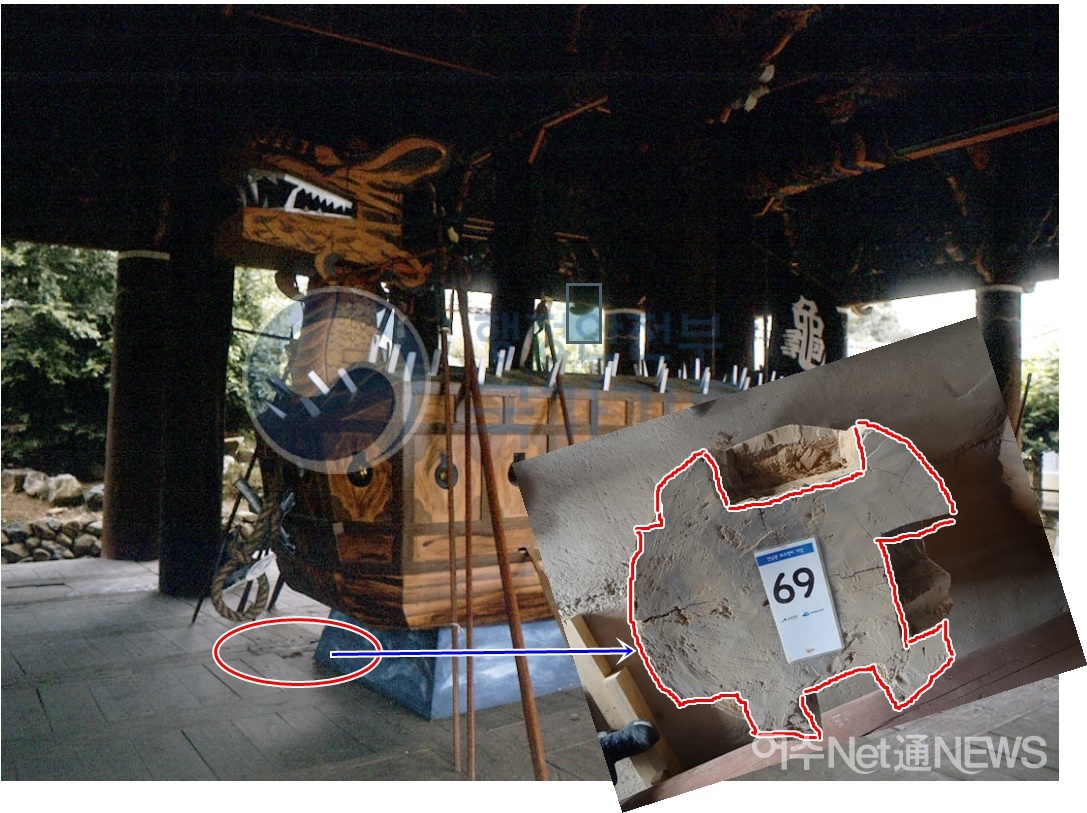 80년대 진남관 내부 마루 위에 전시된 거북선이 놓인 사진에는 거북선 주변 일부 마루를 자세히 보면 잘린 기둥(69번)의 윗부분이 그대로 마루바닥을 이루고 있는 것을 볼 수가 있다.