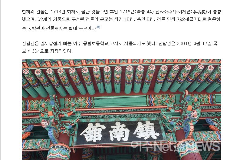 여수시 홈페이지 ‘여수문화관광’소개에도 진난관은 “68개의 기둥으로 구성”돼 있는 것으로, ‘다음백과’를 비롯한 각종 안내에도 “68개의 기둥으로 구성된 건물”로 표기돼 있다.