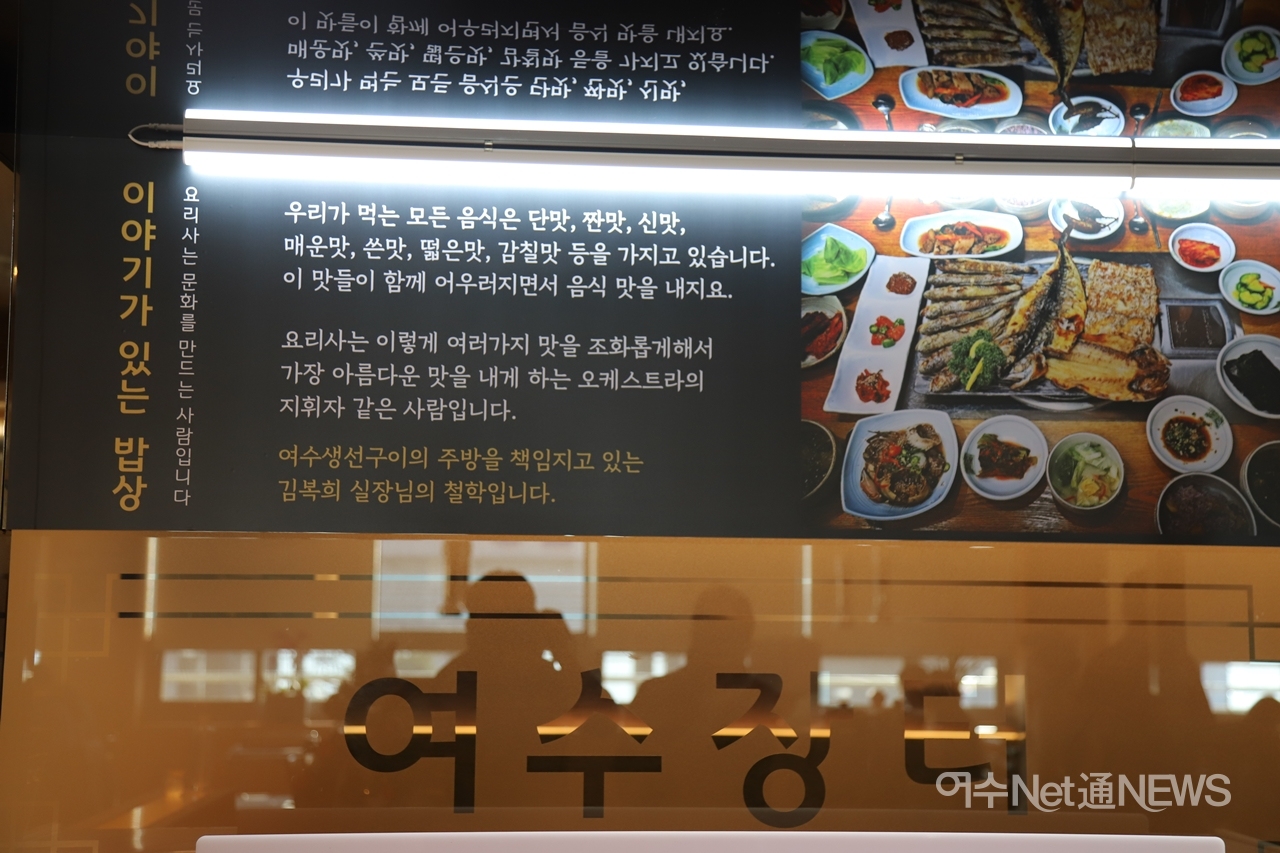 ‘생선류 – 여수 산지 직송. 대한민국의 식문화를 바꿉니다!’를 모토로 여수생선구이가 내건 3가지 슬로건은 '음식 맛을 실린 건강한 밥상, 격이 있는 밥상 한상차림, 음식을 대하는 바른 마음'을 내걸었다.