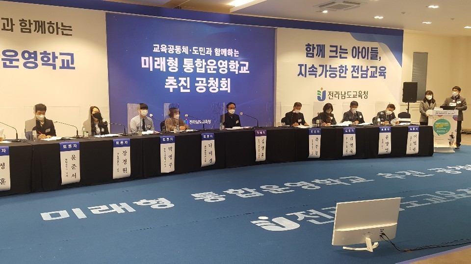 도교육청은 17일 오후 나주 시티호텔에서 교육공동체·도민과 함께하는 미래형통합운영학교 추진 공청회를 열고 ‘(가칭)미래형 통합운영학교 추진 기본계획’을 발표했다. 공청회는 유튜브 전남교육TV로 생중계됐다.