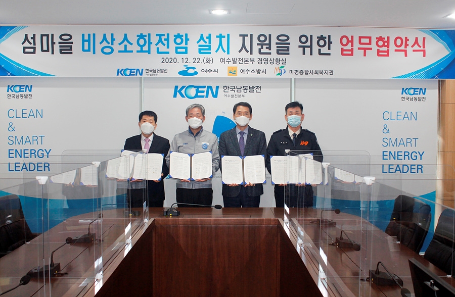 여수시가 한국남동발전(주) 여수발전본부, 여수소방서, 미평사회복지관과 섬마을 안전확보를 위한 ‘비상소화전함 설치사업’ 업무협약을 체결했다.
