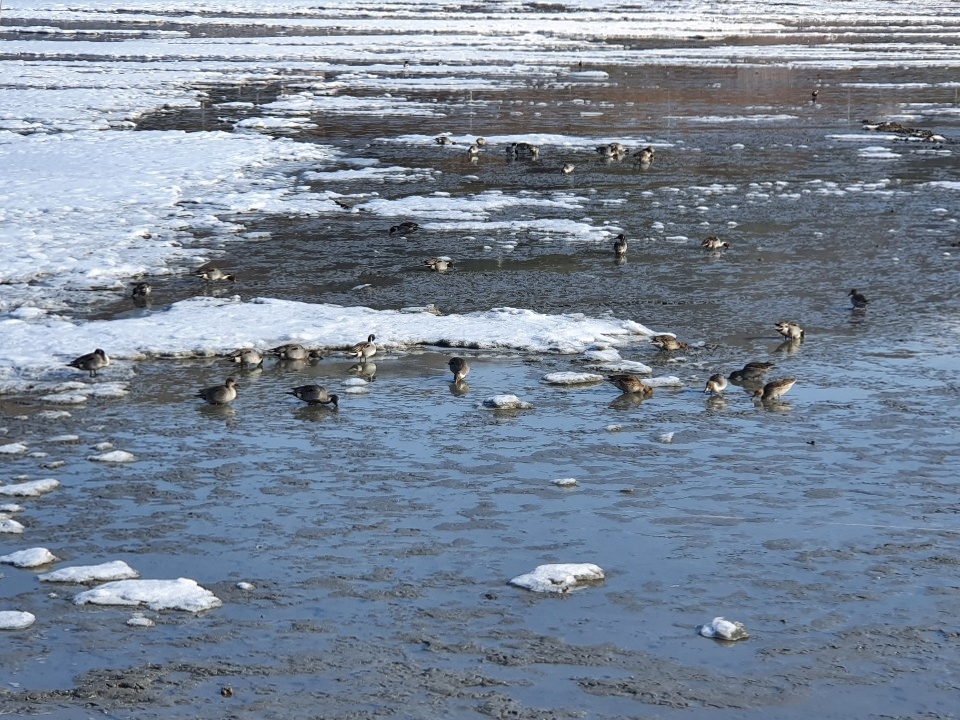 하얗게 언 얼음바다를 나란히 하고 걷다보니, 어느새 복촌마을을 지나고 반월마을에 접어 들었다. 정자에 앉아 보온병에 담긴 커피 한 잔 마시며 쉬다가 앞으로 전진하기로 한다.