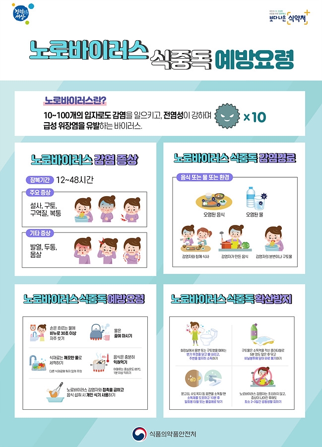 노로바이러스 식중독은 오염된 음식물과 물을 섭취하였거나, 환자 접촉을 통한 사람 간 전파가 가능한 감염병으로, 주로 11월에서 2월 사이 겨울철에 집중적으로 발생한다.