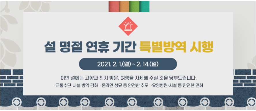 ‘설 연휴 코로나19 특별방역기간’은 2월 1일부터 14일까지이며 의료시설 및 방역체계 비상근무, 취약지역 방역관리 실태점검, 도민 대상 생활방역 홍보 강화 등 특별방역대책이 시행될 예정이다.