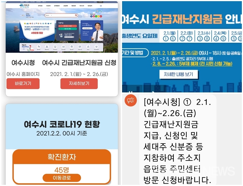 이후 여수시는 지난달 29일 여수시청이 보낸 안전안내문자를 통해 “1일부터 순차적으로 여수시에 주소를 두고 있는 시민과 다문화 가족 28만 4천 여 명을 대상으로 1인당 25만 원의 재난지원금을 지급한다”면서 “2.1.(월)~2.26.(금) 긴급재난지원금지급, 신청인 및 세대주 신분증 등 지참하여 주소지 읍면동 주민센터 방문 신청바란다”라고 공지했다.
