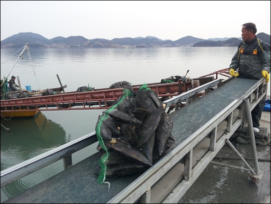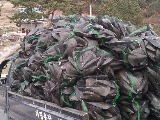 20일 여자만 키조개 출하현장을 찾았다. 바다에서 작업을 마친 한척의 작업선은 부둣가에서 게지를 한참 차량에 옮겨 싣고 있는 중이다. 게지를 옮겨 싣는기계인콤베어는 쉴 새 없이 돌고 있다. 콤베어에 실려 오는 키조개는 한조랑에 30개씩 묶여있다. 키조개 잡이 00호가 오늘 잡은 양은 1톤트럭을 가득 채웠다. 약 1톤의 물량이란다. 수량으로는 약 6000개의 숫자다. 이곳에서 출하되는 키조개는 한 개에 1300원에 출하되고 있다.