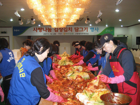 여수농협 고향생각주부모임(회장 신상엽)은 지난 21일, 회원 50여명이 참여한 가운데 김장김치 담그기 행사를 가졌다. 이날 담근 김장김치는 5kg 80박스를 관내 경로당 65개소와 복지아동센터 등에 전달했다.여수농협 고향생각주부모임은 이외에도 지역 어르신을 위한 경로당 청소를 수시로 실시해 온기있는 경로당 활성화에 기여하고 있다.