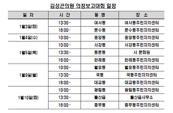김성곤 의원 (민주통합당, 여수 갑)이 3일부터 10일요일까지 2012 순회 의정보고회를 개최한다.김 의원은 지난해 말 통과된 ‘여수세계박람회 지원 및 사후활용에 관한 특별법’ 등과 각종 지역예산에 대한 설명 할 것으로 보인다.김 의원은 또 4월 총선을 앞두고 지난 4년간의 의정활동을 정리해 지역구민에게 보고하는 자리가 될 것이라고 전했다.