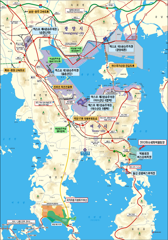 현재 박람회 환승주차장은 주 주차장으로 활용될 여수산단 96블럭(17km 20분)과 율촌산단(26km 30분), 순천신대지구(25km 35분), 광양마동지구(30km 30분), 돌산관광버스주차장(6.8km 10분) 등 총 6곳에서 운영된다.