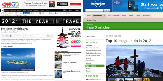 여수세계박람회 조직위원회는 미국의 뉴스 전문 채널 CNN이 운영하는 CNNgo사이트에서‘2012년에 꼭 가 봐야 할 최고의 여행지 7곳’ 1위에 여수세계박람회 개최지인 ‘여수’가 선정됐다고 밝혔다.