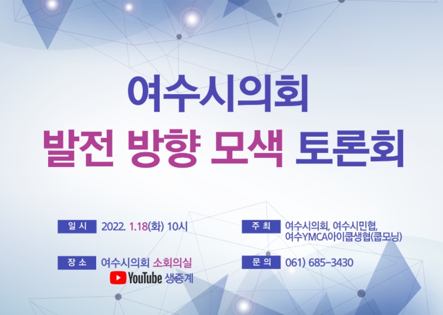 이번 토론회는 여수시의회, 여수시민협, 여수YMCA아이쿱생협(쿱모닝)이 공동주최하며 유튜브 생중계로도 볼 수 있다.