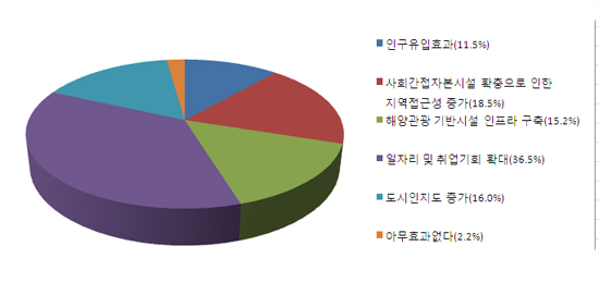박람회 개최 효과에 대해 응답자 중 36.5%가 일자리 및 취업기회 확대를 꼽았다. 그동안 지역에서는 박람회를 통해 ‘사회간접시설 확장으로 인한 지역접근성 증가(18.5%)’하면 ‘해양관광기반시설 인프라 구축(15.2%)’으로 관광도시를 만든다는 도식적인 생각을 가지고 있었다. 시도 이를 바탕으로 ‘국제해양관고아레저스포츠도시’를 만든다는 복안을 만들었다.