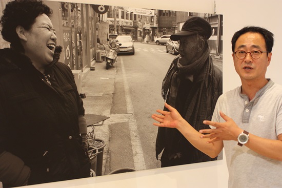 "'한센인은 우리의 이웃이라는 모토'가 바로 이 사진이다. 지금도 한센인이 식당을 가면 대부분 밥을 안 팔려고 한다. 한센인에게 밥을 파는 식당아줌마 김옥희씨가 있다. 이 분은 사람을 차별해서는 안 된다는 신념을 가지고 있더라. 한센인들이 외출하면 이 식당에 가서 밥을 먹고 이 분을 만나면 환하게 웃는다. 이 사진을 찍으면서 몸에 소름 끼치는 기분이 들었다. 환자로서의 한센인이 아니라 인간으로서의 한센인을 표현하고 싶었는데 딱 그 장면이 나왔다. 일반인과 한센인이 마주보며 공존해야 한다는 메시지가 담긴 작품이다."