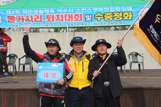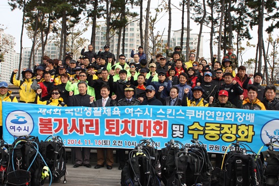 '불가사리 포획'이 바로 그것. 주말을 맞은 지난 15일 '생활체육여수스킨스쿠버연합회 불가사리 퇴치 대회 및 수중 정화' 행사가 웅천 인공해수욕장에서 열렸다. 올해 4회째를 맞고 있다. 이날은 바다라는 공통분모로 다이버들이 교류하고 소통하는 날이다.