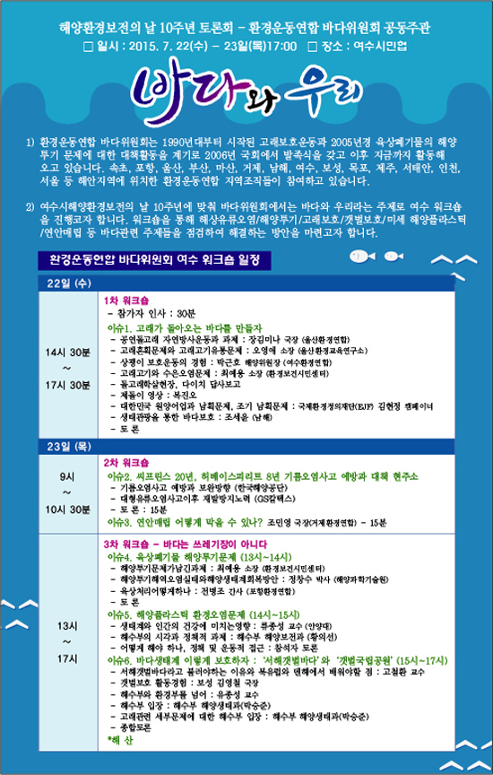 워크숍은 1, 2차로 나눠진행된다. 22일 진행되는 1차 워크숍에서는 고래보호운동을 위한 ‘고래가 돌아오는 바다는 만들자’가 진행된다.