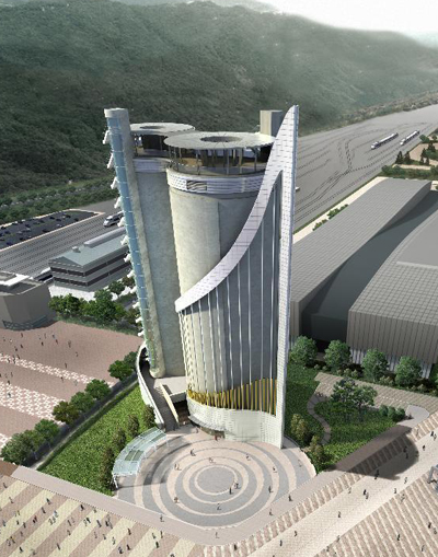 스카이타워는 친환경 박람회의 정신을 구현하기 위해 여수신항내에 있던 폐시멘트 저장탑을 예술작품으로 재활용한 것으로 지난해 9월 국제현상공모를 거쳐 콘텐츠를 확정하고 올 해 6월 본격적으로 착공했다.