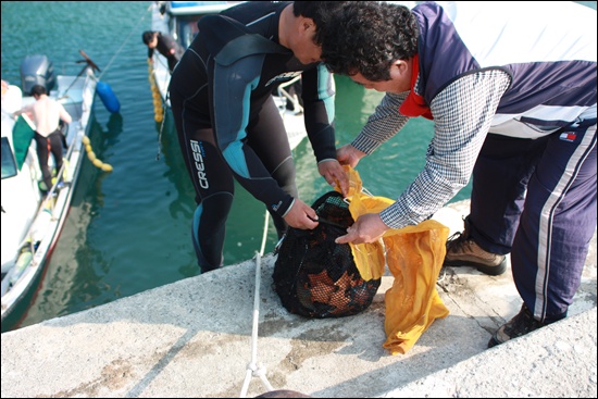 이날 수중정화 활동 작업은 안도 방파제 주변과 남해수산연구소 바다목장에 위치해 있는 양식장 주변에서 시작되었다. 오후에는 동고지 마을 선착장 주변에서 정화활동을 펼쳤다. 회원들은 방파제 옆에 널린 폐어구와 폐그물, 그리고 수중에 가라앉아 있는 플라스틱과 불가사리 등을 건져 올렸다.