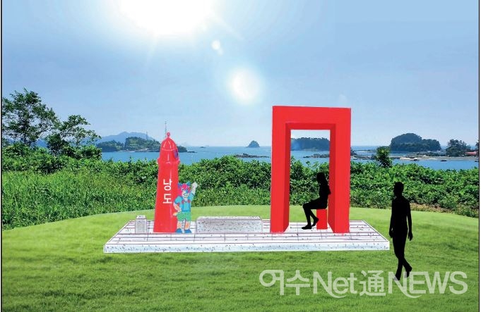 빨간 등대와 낭도의 상징인 ‘여우’ 캐릭터 곁에 화강석 의자에 포즈를 취할 수 있도록 한 ‘포토존’은 아직 터만 닦았다. 막바지에 외부 업체에 의해 포토존 설치물은 자리잡게 된다.