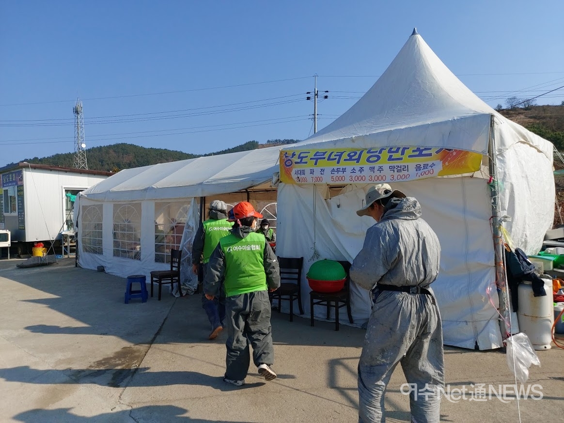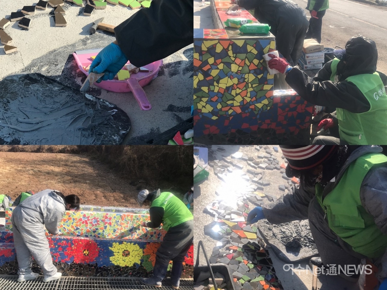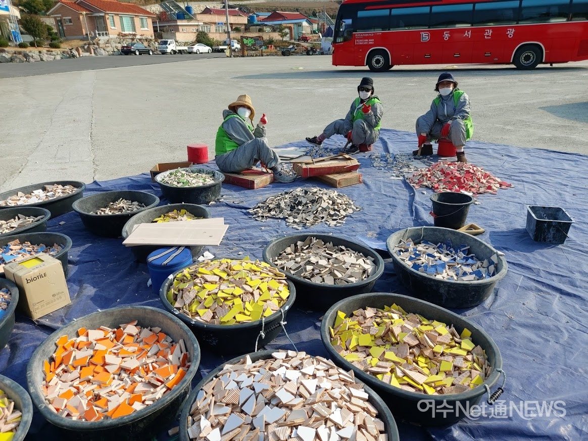 지난 18일에 만난 낭도 미술작업 현장 중엔 ‘마을 쉼터’설치 현장이 가장 북적였다. 마을과 약간 떨어진 공터 주차장 주변에 조성되고 있었다. 거긴 타일작업이 한창이었다. 여기에 소요되는 타일 조각은 낭도항 주차장 한 켠에서 현장 공급용으로 쪼개지느라 여념이 없다.
