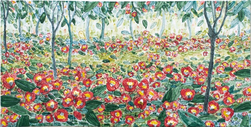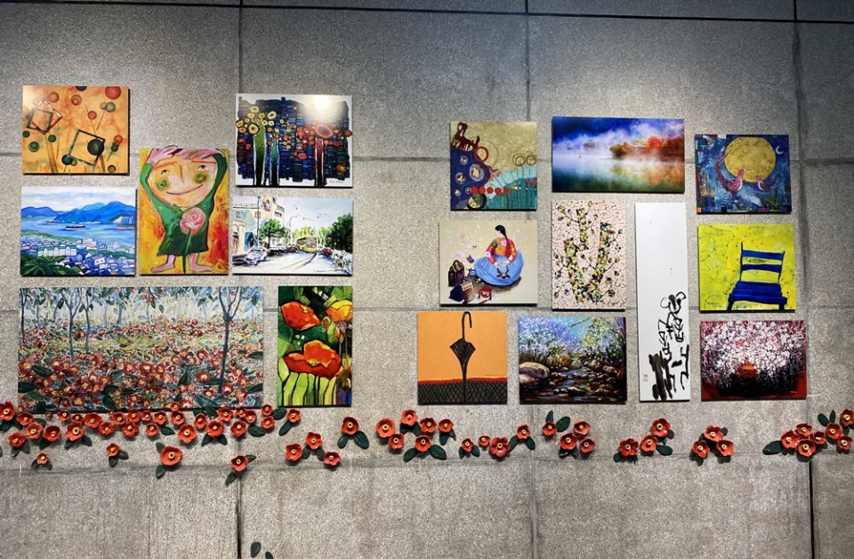 또한 작품 뿐 아니라 한쪽 벽면에 붙은 동백꽃은 변정옥 도예작가가 학생들과 함께 공방에서 만든 작품이라 의미를 더했다. 여수여고 동아리 학생들이 학교에서 직접 빚은 도예작품을 변정옥 작가가 공방에서 구워와 완성했다.